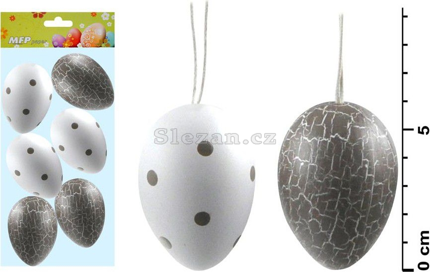 BALENÍ OBSAHUJE: - 6 ks plastových vajíček - bílo-šedá kombinace - vajíčka mají provázek na pověšení