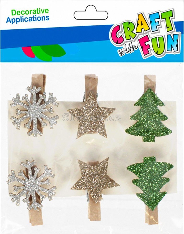 Sada obsahuje 6 ks mix kolíčků na prádlo: 2x vánoční stromeček, 2x hvězda, 2x vločka.