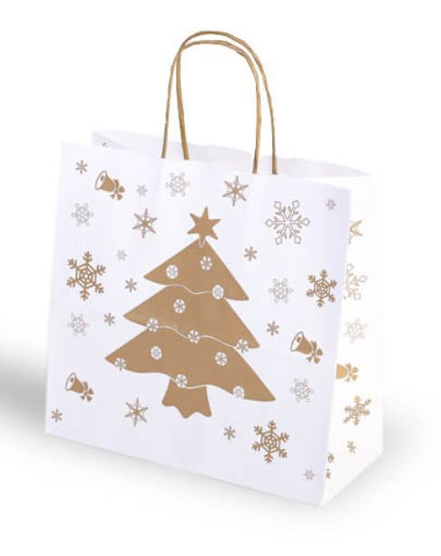 Papírová taška s vánočním motivem a krouceným uchem.