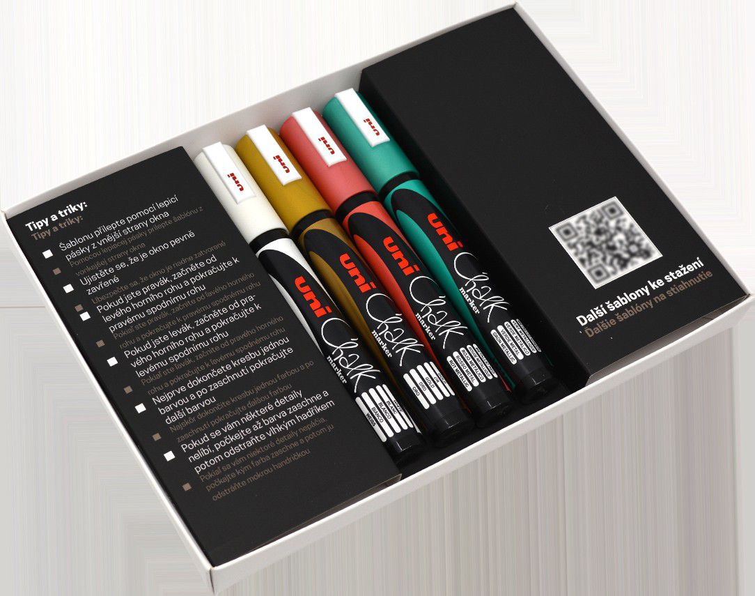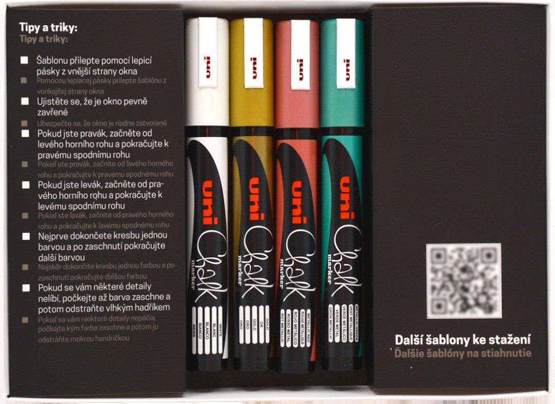 Unikátní křídové popisovače promění každý skleněný, okenní nebo zrcadlový povrch v designerské plátno čekající na vaše kreativní nápady. Vytvářejte nádherné originální dekorace, dodejte rodinné oslavě originalitu nebo si jenom pojďte hrát a malovat. Syté barvy popisovačů v prostoru krásně vyniknou. Pokud vás dekorace již omrzela stačí povrch otřít mokrým hadříkem a začít znovu.