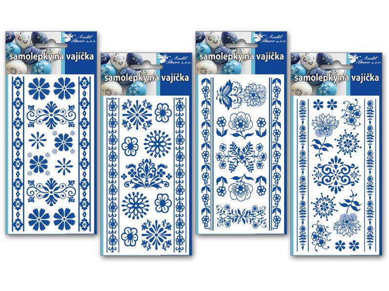 Samolepky na velikonoční vajíčka v modrobílé barvě.