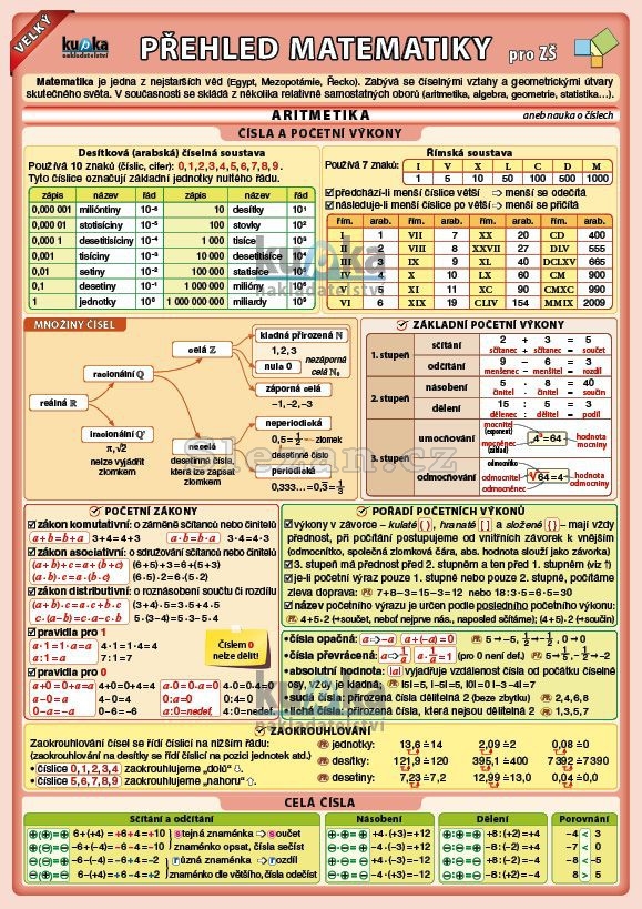 Přehledně zpracované učivo základní školy – od základních početních výkonů až po geometrii a statistiku.