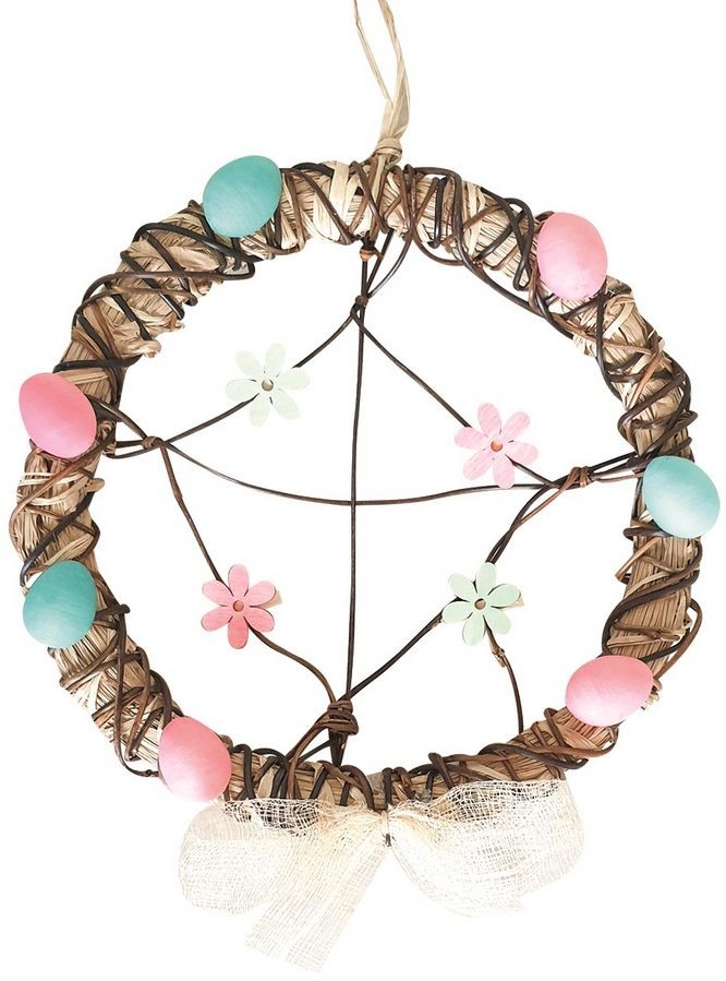 Věnec s vajíčky a dřevěnými květinkami krásně ozdobí Vaši stěnu či dveře.