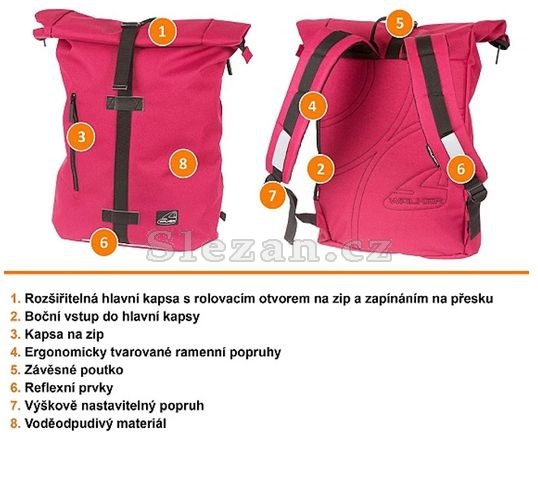Horní část lze rolovat a pojistit přezkou na předním dílu.