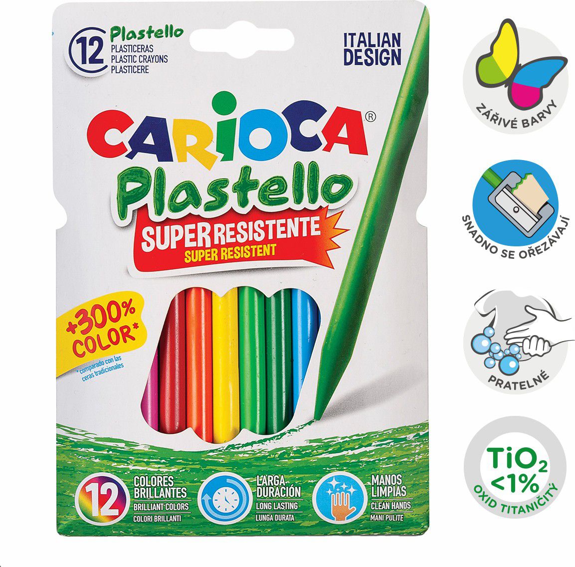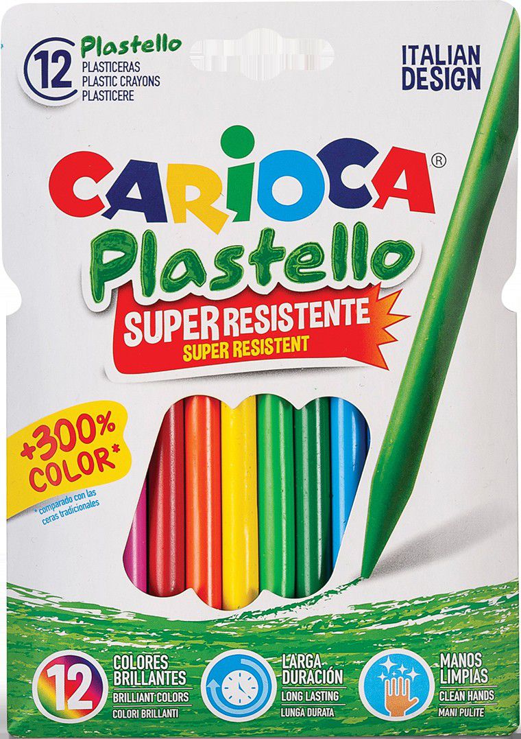 Plastové voskovky pro čisté kreslení bez kompromisů. Objevte pevné voskovky nové generace Carioca Plastello, které zanechávají barvy pouze na papíře, nikoliv na rukou. Zářivé a intenzivní barvy pro každé umělecké dílo! Snadno se ořezávají a jsou vhodné pro běžné kreslení. Nevhodné pro děti do 3 let.
