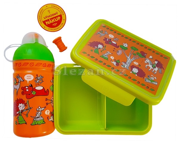Výhodný set, který obsahuje: Zdravou láhev s náhradní zátkou, svačinový box zdravá sváča a krytku Floppy.