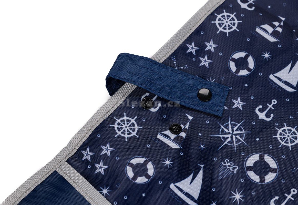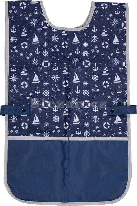 V letošní kolekci nabízíme také nový střih zástěrky na výtvarnou výchovu, která je zapínatelná na praktické druky. Dítě nemusí zástěrku zavazovat na zádech, druky si snadno nastaví velikost kolem pasu a zároveň má díky novému střihu chráněnou větší část těla. Zástěrka je vybavena dvěma kapsami a je snadno omyvatelná.