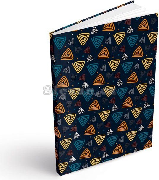 Záznamová kniha MFP ve formátu A5, linkovaná, s výrazným geometrickým motivem tvořeným trojúhelníky na tmavě modrém podkladu.