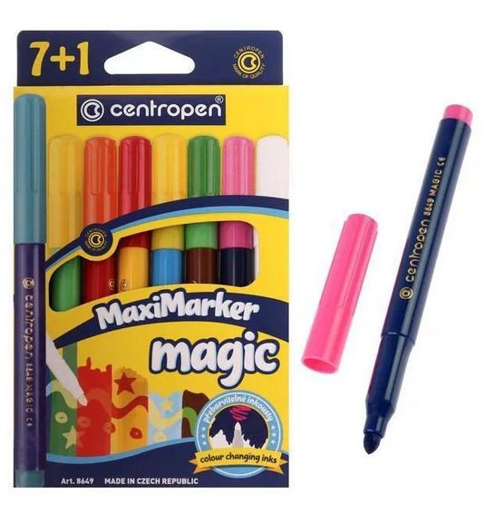 Značkovače MAGIC mají trojúhelníkovou úchopovou část, odpovídající nejnovějším trendům v ergonomii psaní a kreslení. Jsou naplněny „magickými“ inkousty, které mění barvu po přebarvení přiloženým zmizíkem. Takto získáte z jedné sady (7 značkovačů a 1 zmizík) celkem 14 barev. Pláště značkovačů jsou v barvě inkoustu, chránítka značkovačů jsou v barvě vzniklé po přebarvení. Průměr hrotu 5 mm.