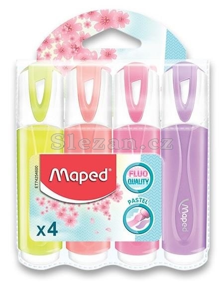 Balení obsahuje 4 zvýrazňovače v pastelových barvách (žlutá, oranžová, růžová, fialová).