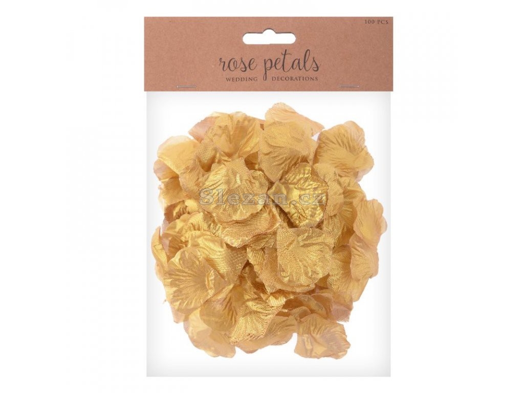 Okvětní lístky růží, zlaté, zabalené v pytli. Balení: 1 balení obsahuje 100 kusů. Skvělé pro dekoraci svatebních i svátečních příležitostí. Vhodné na stoly i jako náplň do košíčků pro družičky.