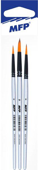Sada 3 kulatých štětců s jemným syntetickým vlasem tvarovaným do špičky a dřevěnou rukojetí. Díky syntetickým vláknům usnadňují roztírání barev a dobře drží tvar. Vlákno je elastické a vyniká vysokými absorpčními schopnostmi. Jsou méně náchylné k poškození barvami a ředidly než štětce přírodní. Jsou také výrazně odolnjěší proti poškození či lámaní. Snadno se udržují v čistotě, a proto vykazují delší životnost. Hodí se jak pro školní využití, tak i pro různé malířské techniky a povrchy. Ideální pro malování detailů, vybarvování nebo obtahování. Štětiny jsou chráněny plastovou krytkou. OBSAH BALENÍ: - 3 ks štětců Velikost: 6, 8, 10 Barva: stříbrná/černá Materiál: syntetické vlákno POUŽITÍ: Na malbu akrylovými, akvarelovými a temperovými barvami. Štětce jsou uloženy v sáčku se závěsem. Uvedená cena je za 1 balení.